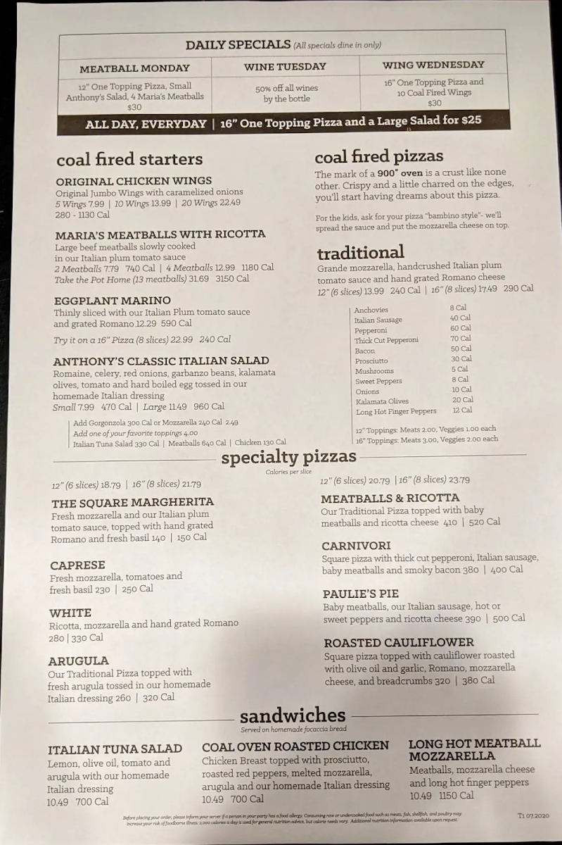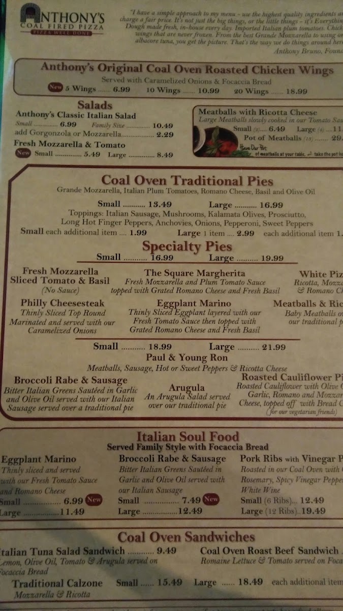 Overall, Anthony's Coal Fired Pizza & Wings menu offers a satisfying range of dishes that cater to different tastes, from fresh salads to hearty pizzas and mouthwatering sandwiches. Whether you're looking for a light bite or a hearty feast, there's something for everyone to enjoy.