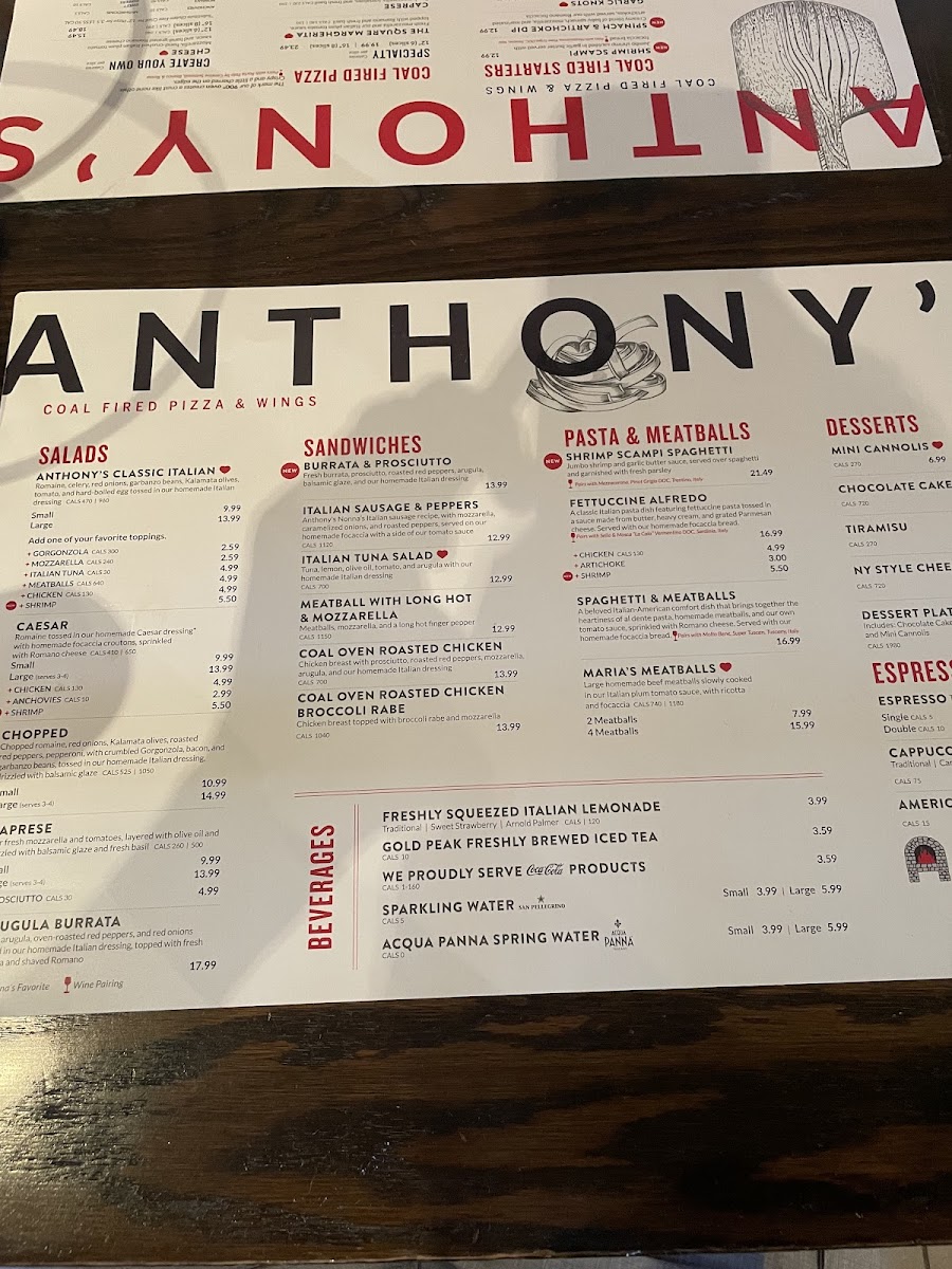 Anthony's Coal Fired Pizza & Wings offers a diverse and flavorful menu that combines classic Italian flavors with a touch of coal-fired tradition. The starters and salads are a great way to kick off your meal, with Anthony's Classic Italian Salad and Caesar Salad both providing refreshing, light options. For something a bit more indulgent, the Garlic Knots and Eggplant Marino are fantastic choices, full of rich, savory flavors.